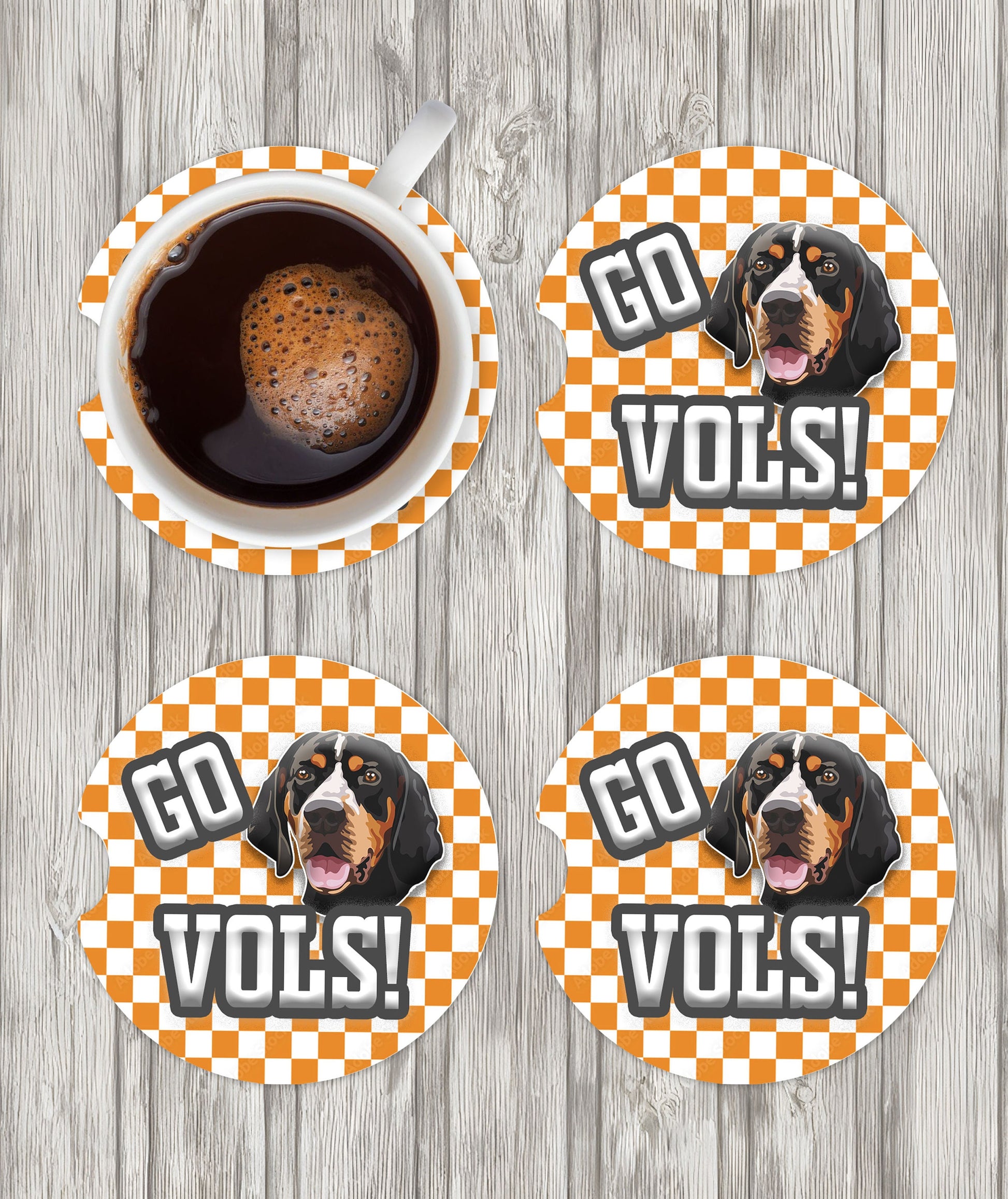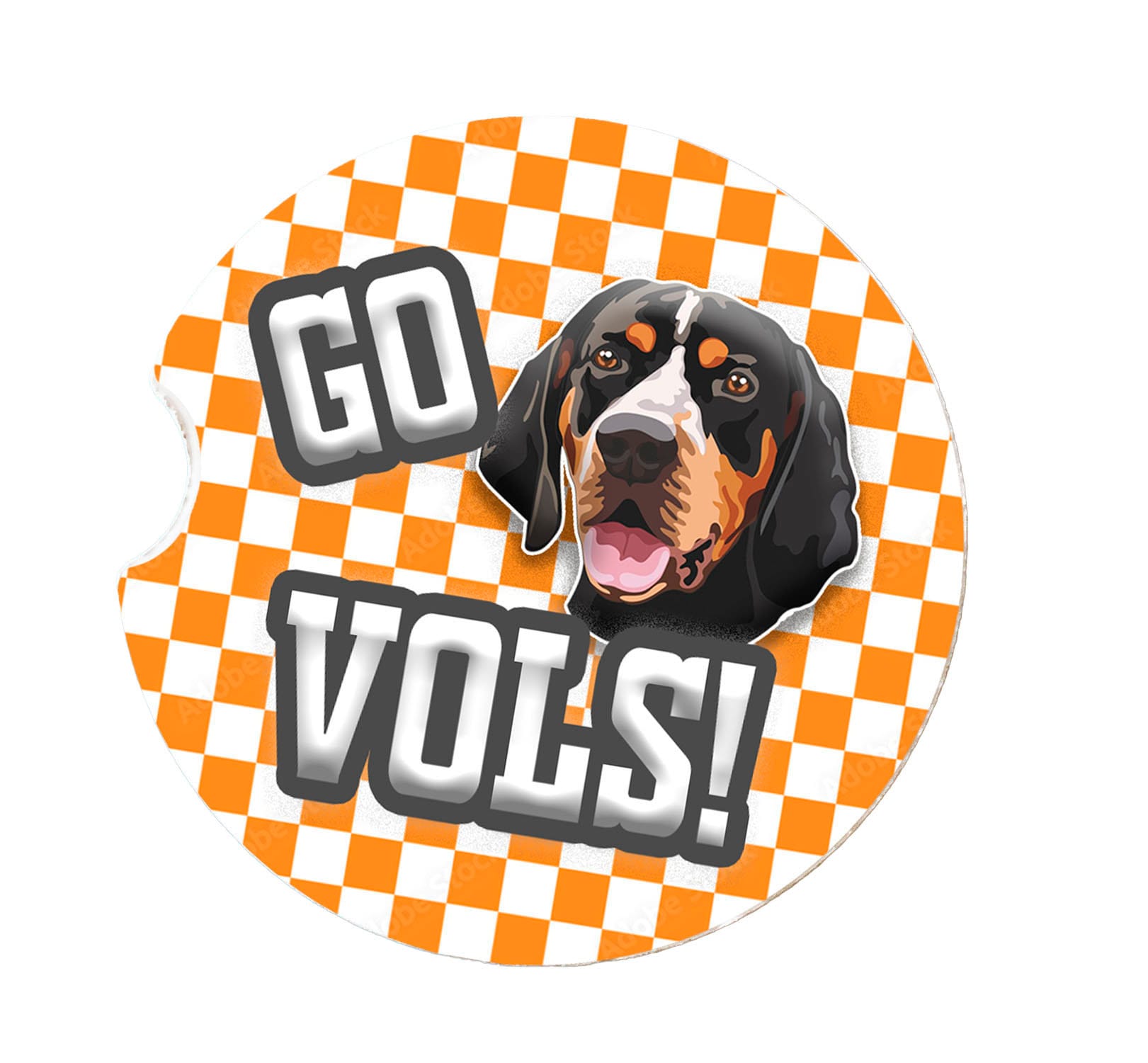 Good Ole' Rocky Top! Show your school spirit with these University of Tennessee themed ceramic car coasters. These coasters are the perfect addition to any car. These 2.5" coasters are made from absorbent ceramic stone that easily absorb the water from the outside of the cup and brings your favorite team to your car. Gift these UT coasters to your favorite Volunteers fan, friends, family, student, or Alumni. These Vols car coasters feature a Tennessee orange checkerboard background with Smokey inspired Blue Tick Hound and Go Vols! in the center. One order is a set of two coasters.